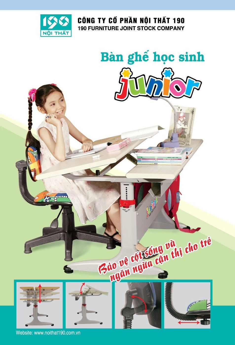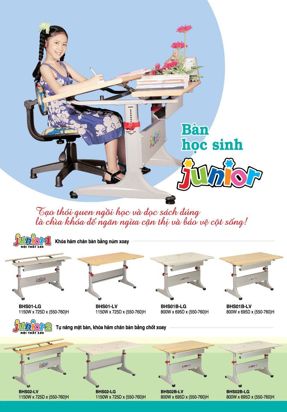 - Bàn học sinh BHS01B-LV thuộc dòng sản phẩm bàn Junior của Nội thất 190 với các tính năng điều chỉnh linh hoạt luôn phù hợp hoàn hảo với trẻ ở mọi giai đoạn phát triển và cung cấp sự hỗ trợ tối ưu cho hệ thống cột sống và cơ bắp, giúp trẻ ngồi học thoải mái trong 1 khoảng thời gian dài.