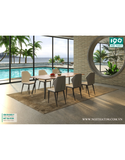 Chất liệu: Bàn ăn chân sắt ống Ø50 tóp côn, liên kết với chân tăng chỉnh mạ Niken bằng khớp nối nhôm hợp kim cao 5cm. Khung đỡ mặt bàn bằng thép hộp 25x50, sơn đen sần hoặc kem. Mặt bàn cốt gỗ plywood dày 18mm phủ melamin 2 mặt. Cạnh bàn vát chéo.
